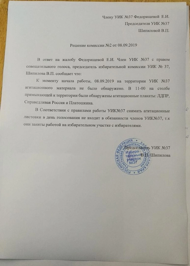 Журналисты «АмурМедиа» раскопали любопытную историю по участку № 37. Придя на участок наблюдатели обнаружили прямо перед входом незаконную агитацию от ЛДПР. Председатель УИКа отказалась снимать агитационные листовки, так как, по ее мнению, это не входил в обязанности членов избирательной комиссии.