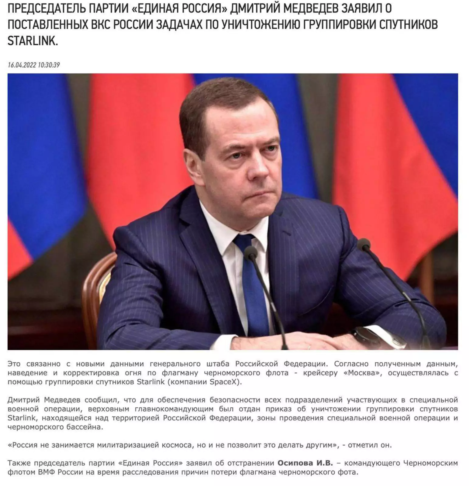 В украинских пабликах появилась новость, будто заместитель председателя Совета безопасности РФ Дмитрий Медведев предложил уничтожить спутники Starlink Илона Маска.