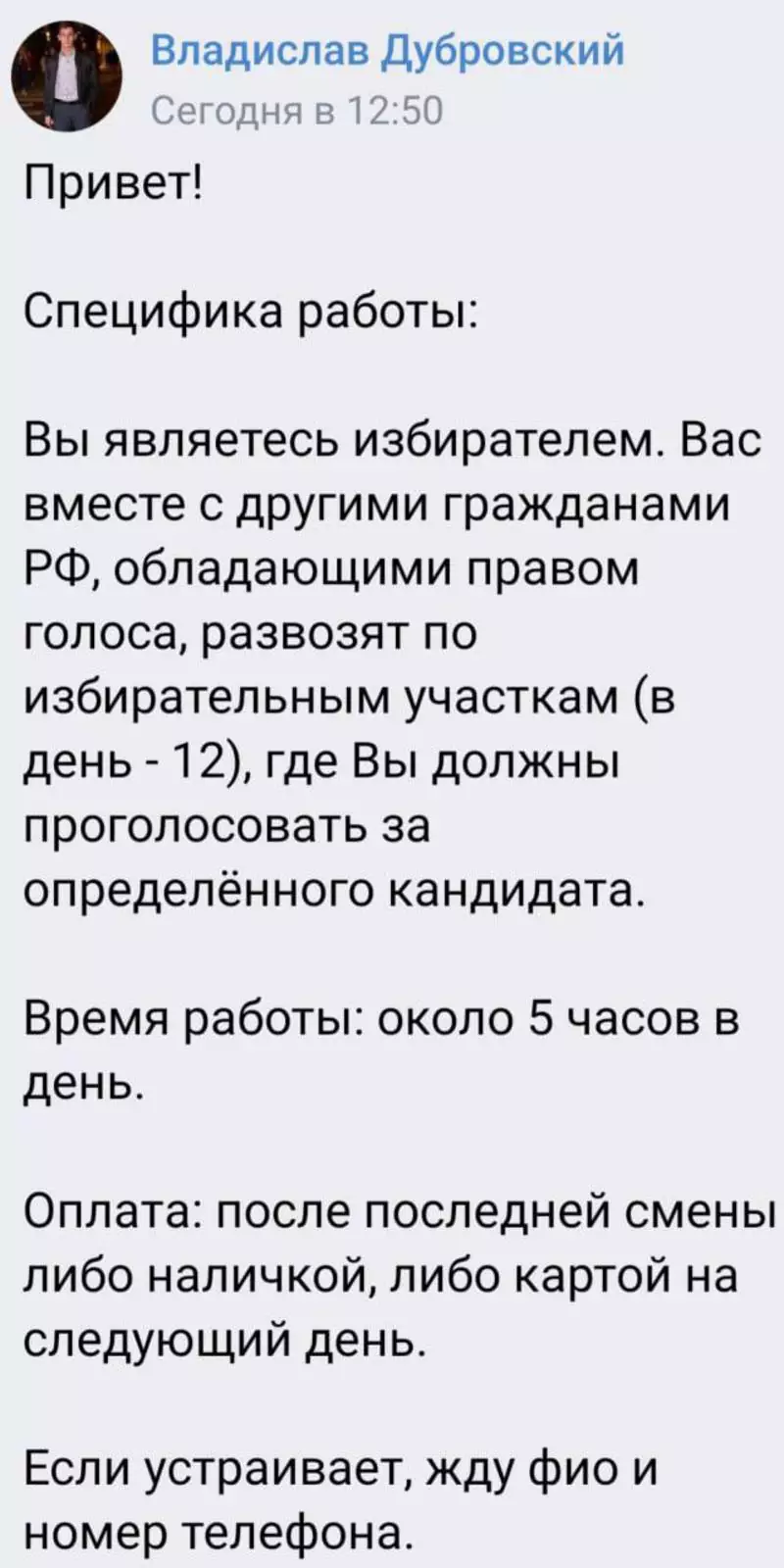 Речь идет об объявлении о трудоустройстве, размещенном неким Владиславом Дубровским. Соискателям предлагается ездить на предоставляемом транспорте все три дня голосования от участка к участку и голосовать за того кандидата, за которого скажет работодатель.