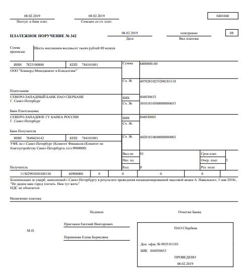 Компания «Конкорд менеджмент и консалтинг», принадлежащая бизнесмену Евгению Пригожину, якобы выплатила властям Санкт-Петербурга компенсацию ущерба, который, по мнению прокуратуры, был нанесен сторонниками Алексея Навального в ходе митинга 5 мая прошлого года. Информация об этом размещена в группе предприятия в социальной сети «ВКонтакте». К публикации приложено платежное поручение на сумму шесть миллионов восемьсот тысяч рублей.