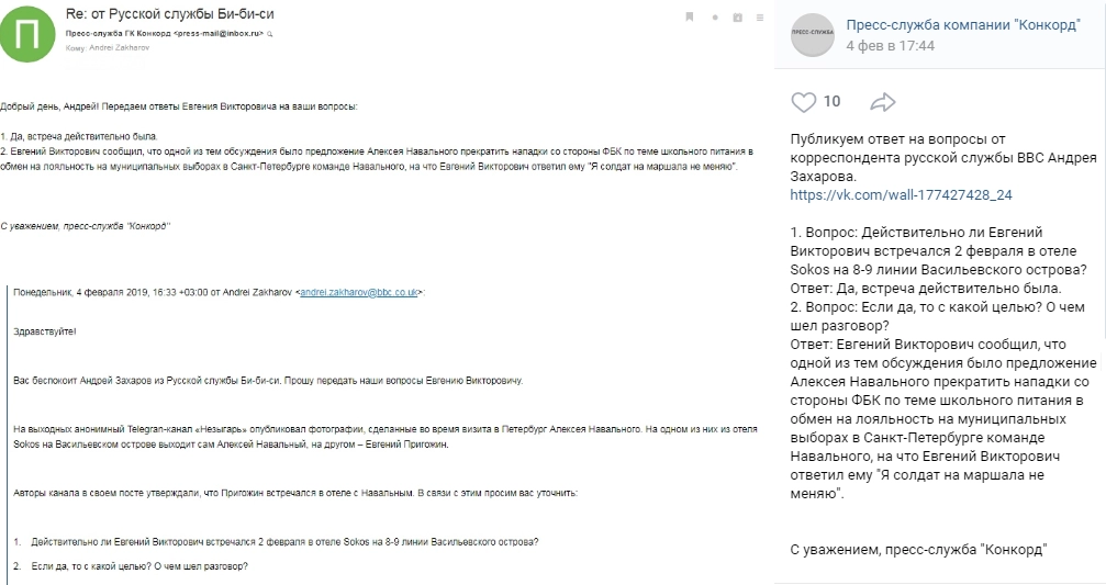 Ранее в этой же группе появились сообщения о встрече Евгения Пригожина и Алексея Навального в отеле Sokos на Васильевском острове. Авторы поста утверждают, что Навальный будто бы предлагал Пригожину прекратить нападки со стороны ФБК на подконтрольные ему фирмы в обмен на лояльность во время муниципальных выборов в Петербурге.