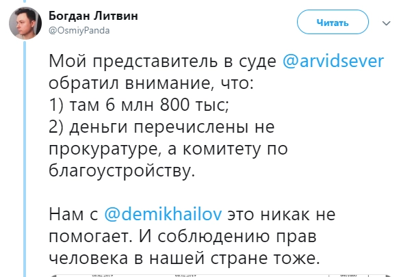 Однако счастье оппозиционера было недолгим. Сторонник Навального и фигурант дела о нанесении ущерба Богдан Литвин написал в своем twitter-аккаунте, что штраф не может считаться оплаченным, поскольку «деньги были перечислены не прокуратуре, а комитету по благоустройству». Кроме того, сумма ущерба составляет семь миллионов триста тысяч рублей. Таким образом, получается, Евгений Пригожин заплатил на полмиллиона рублей меньше, чем надо.