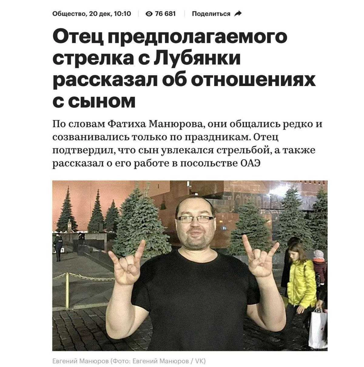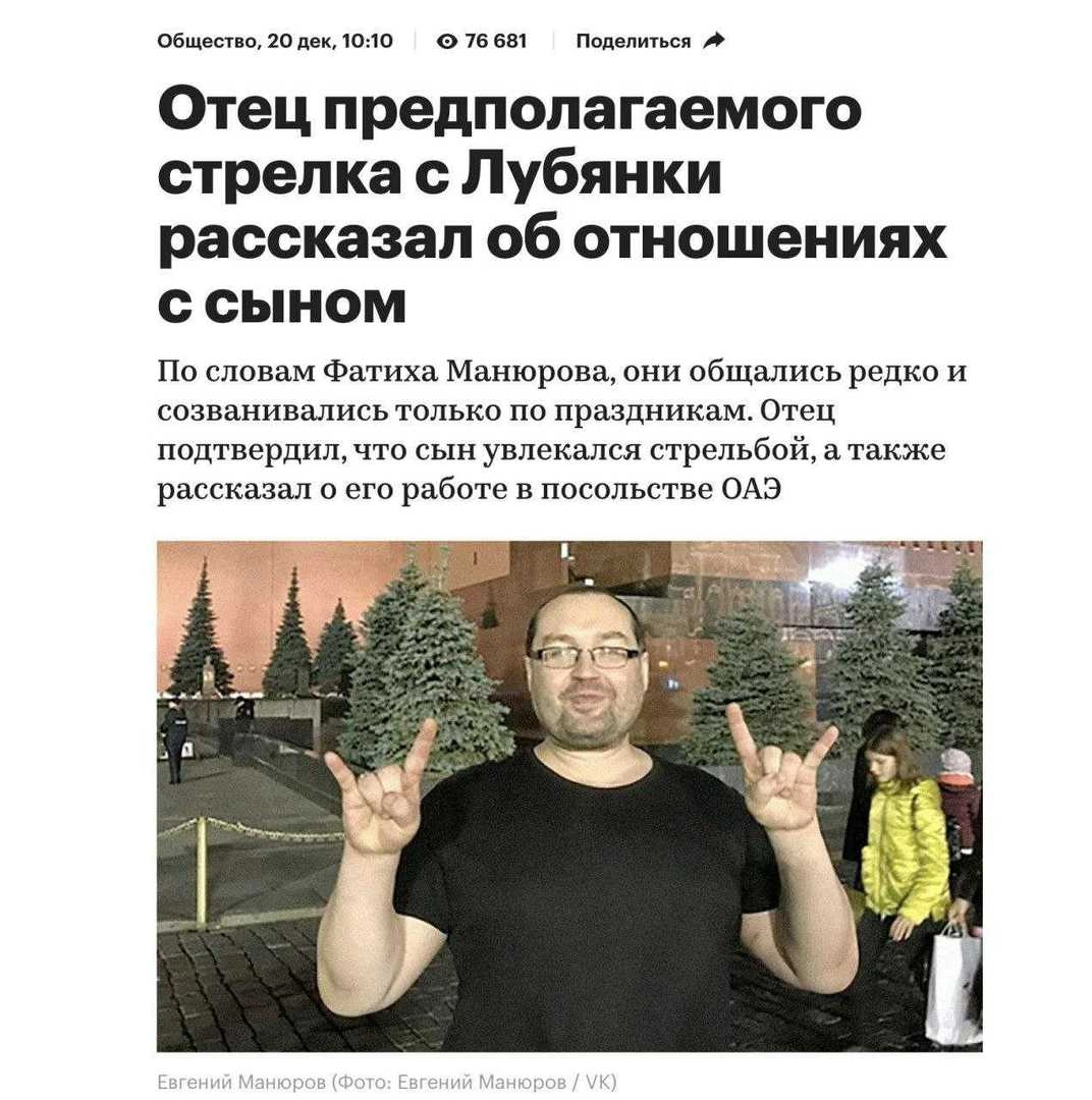 Нападавшим оказался обычный житель Подмосковья, 39-летний Евгений Манюров. Как только журналисты узнали имя стрелка, они, разумеется, начали искать в социальных сетях его фотографии. Так на сайтах российских СМИ появился снимок некоего мужчины на Красной площади, которого пресса и окрестила Манюровым.