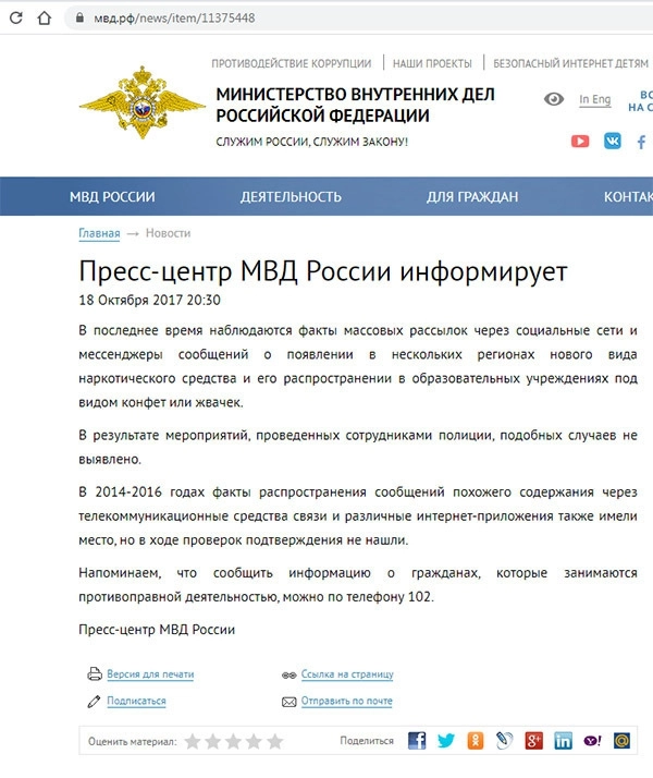 В октябре 2017 года Министерство внутренних дел выступило с официальным заявлением, что информация о распространении в школах наркотических конфет не подтвердилась.