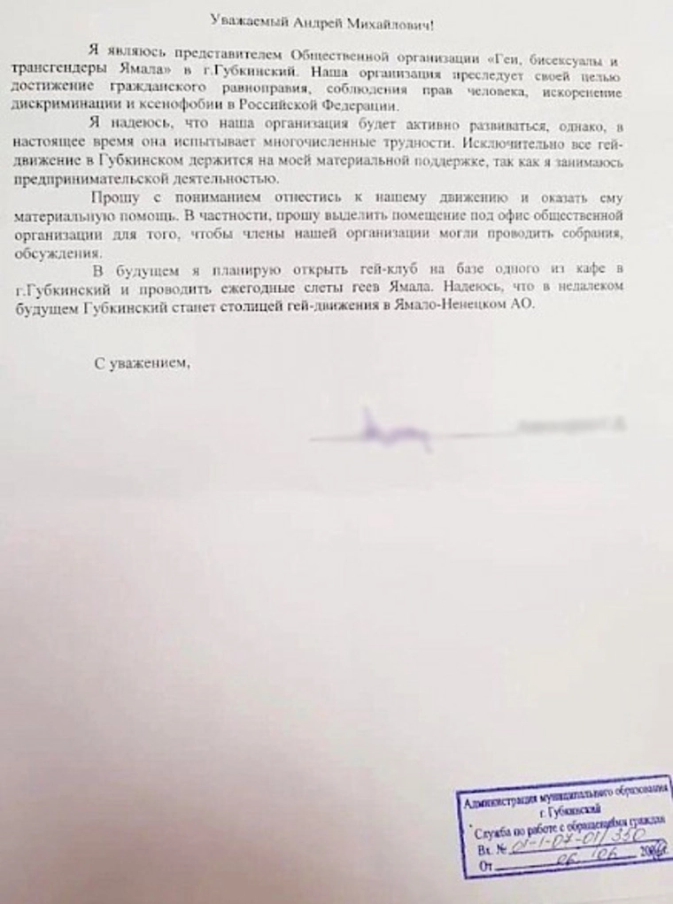 Автор письма называет себя членом общественной организации «Геи, бисексуалы и трансгендеры Ямала в Губкинском» и выражает надежду, что местные власти как-нибудь посодействуют развитию этой структуры. Еще он посетовал, что «всё городское гей-движение существует исключительно за счет его средств», поскольку он единственный в Губкинском предприниматель-гомосексуалист.
