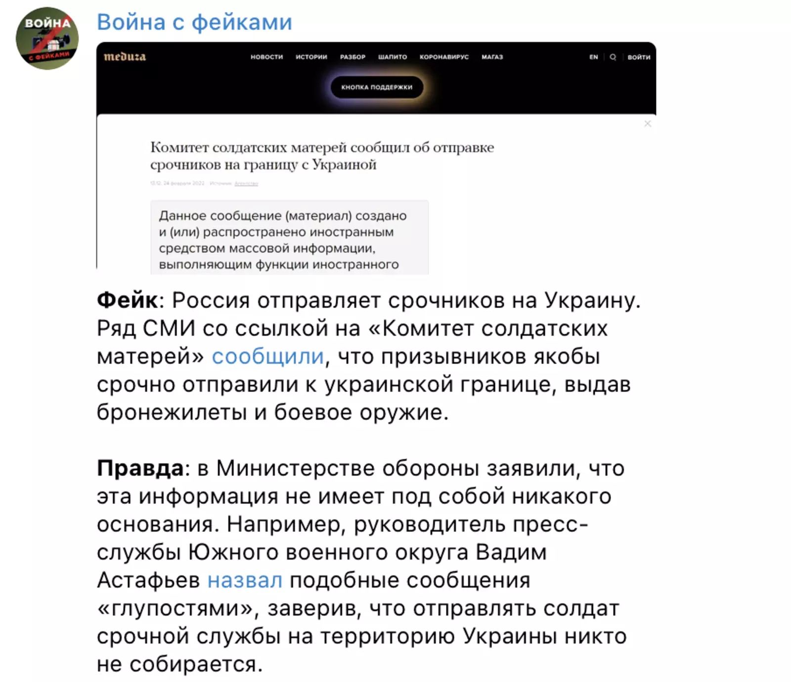 Отметим также, что к числу фейков Минобороны РФ поспешило отнести заявление «Комитета солдатских матерей» о «незаконной отправке срочников на войну», которое опубликовал, в частности, «Ридус».