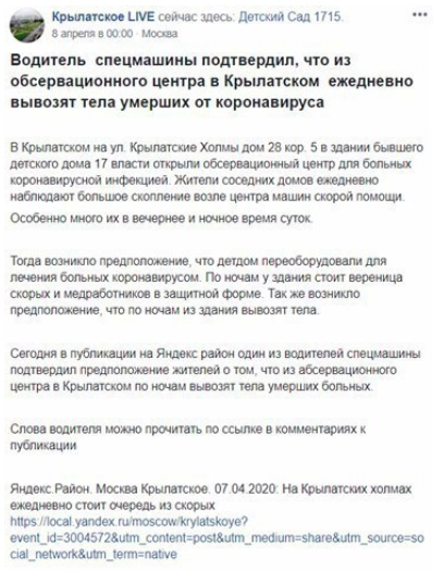 Жители московского района Крылатское выяснили страшную тайна: под покровом ночи из местного обсервационного центра вывозят тела умерших от коронавируса. Об этом фейке рассказал в своем телеграм-канале глава комиссии Общественной палаты России по развитию информационного сообщества, СМИ и массовых коммуникаций Александр Малькевич.