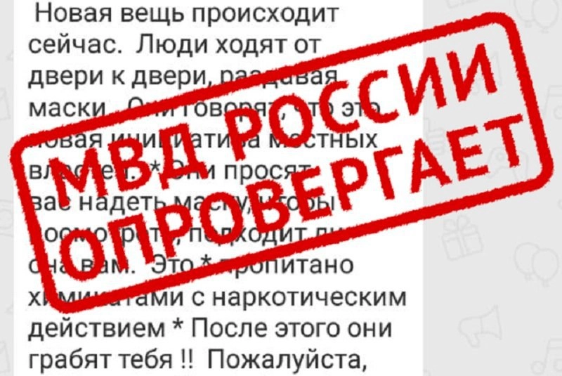 В мессенджерах распространяется байка о том, как фейковые волонтеры ходят по домам, раздают людям пропитанные наркотиками медицинские маски, а после — грабят квартиры.