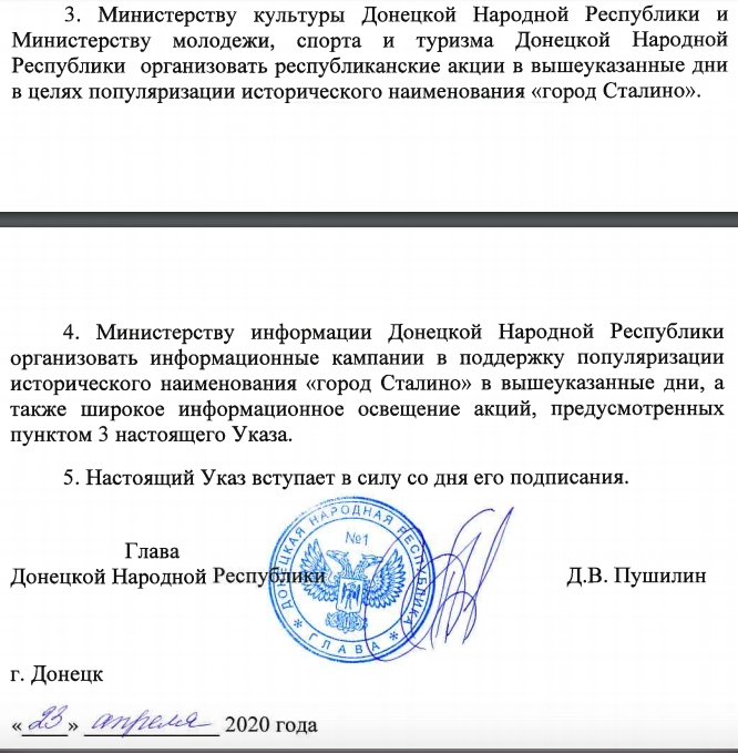 На деле же о переименовании города в указе Пушилина нет ни слова. Говорится в документе о том, что наименование «город Сталино» будет использоваться при проведении мероприятий, связанных со Второй мировой войной. В указе говорится, что одна из целей переименования Донецка — это сохранение исторической памяти: название Сталино город получил в 1924 году.