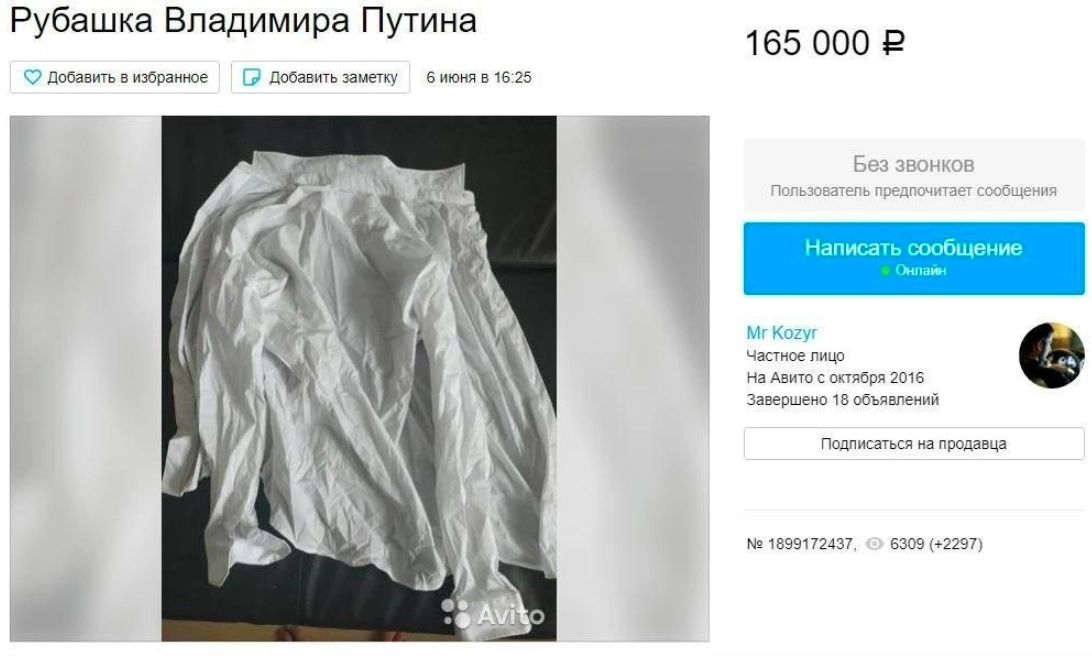 На популярном сайте с объявлениями «Авито» оказалась выставлена на продажу рубашка президента России Владимира Путина. Автор объявления утверждал, что Путин забыл рубашку в нижегородском отеле, а ее принадлежность может подтвердить ДНК-тест. Продавец установил на рубашку ценник в 165 тысяч рублей.