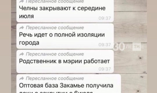 На этой неделе жители Набережных Челнов получили сообщение о полном закрытии города на карантин с 6 июля. Информация распространялась с помощью мессенджеров. Автор сообщения ссылался на своего безымянного родственника, который будто бы работает в мэрии.