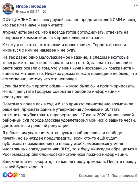 Хорошевский районный суд Москвы признал ложными ранее распространяемые в Telegram-каналах и СМИ сообщения о том, что сын лидера ЛДПР Владимира Жириновского и вице-спикер Госдумы Игорь Лебедев является счастливым обладателем «кучи иностранных гражданств и видов на жительства». Об этом сообщил сам Лебедев на своей странице в Facebook.