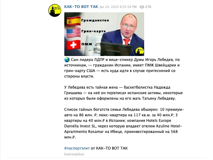 В начале этого года многие Telegram-каналы писали со ссылкой на некие анонимные источники, что Игорь Лебедев имеет гражданство Испании, постоянный вид на жительство в Швейцарии и грин-карту США. Еще говорилось о том, что у Лебедева есть тайная жена — баскетболистка Надежда Гришаева, на которую политик якобы переписал свои испанские активы.