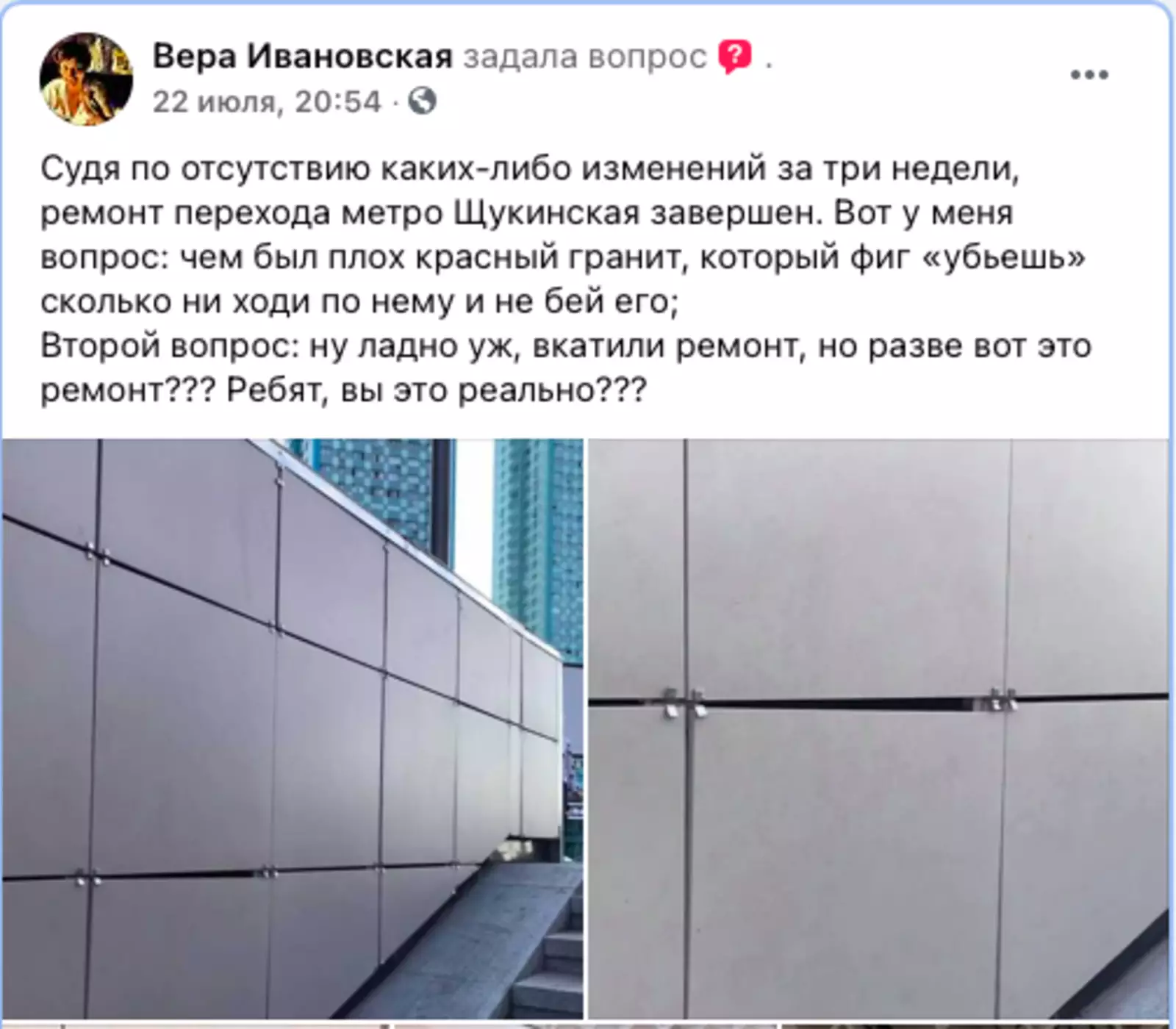 Москвичка Вера Ивановская написала в одном из пабликов в Facebook, что с недавно отремонтированной станции метро «Щукинская» куда-то пропал весь «красный гранит», который «фиг убьешь, сколько по нему ни ходи».