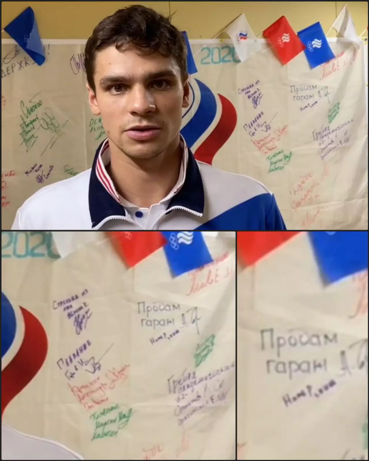 Евгений Рылов записал обращение на фоне флага Олимпийского комитета РФ. Помимо автографов спортсменов, на полотнище красуется надпись «продам гараж».
