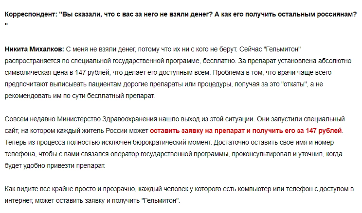 Исцелиться от паразитов режиссеру помог чудодейственный препарат «Гельмитон» (биологически активная добавка — прим. «Ридуса»), якобы указал в конце интервью Михалков. Там же представлена ссылка на сайт, где можно купить это лекарство. Так что материал является сугубо рекламным.
