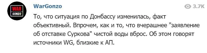 Однако журналист Семен Пегов, ведущий телеграм-канала WarGonzo, поспешил опровергнуть уход Владислава Суркова из аппарата президента РФ. Информацию об отставке он назвал «вбросом». При этом Пегов сослался на собственные источники в администрации главы государства.