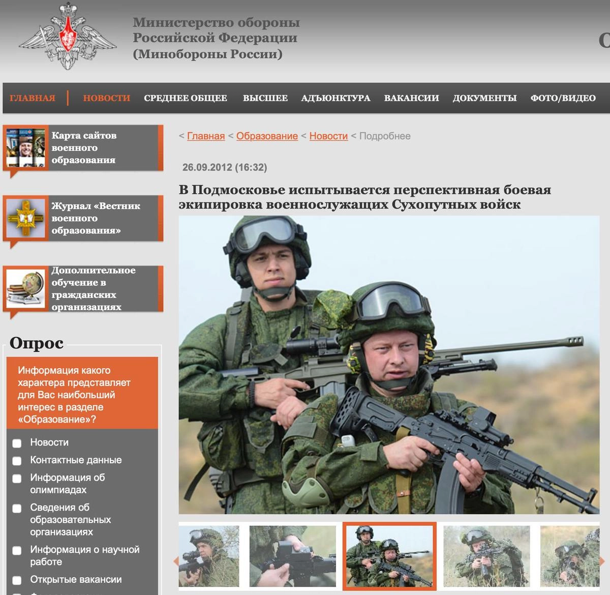 Фото действительно было похищено с сайта Минобороны: в материале рассказывалось об испытании перспективной боевой экипировки военнослужащих Сухопутных войск в Подмосковье.