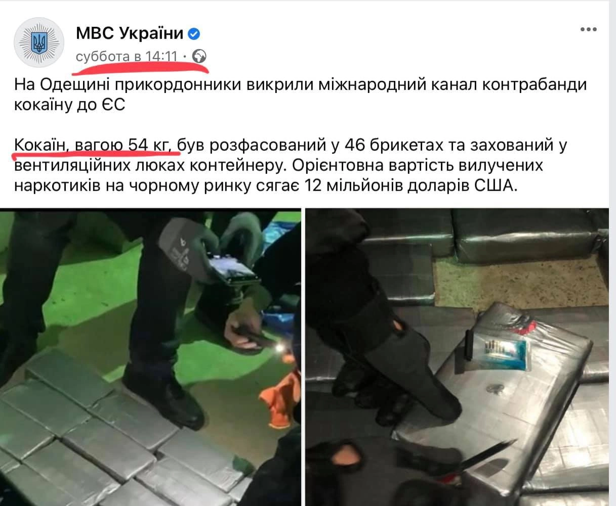 Сперва в МВД отчитались об успешной операции по конфискации 54 кг кокаина: