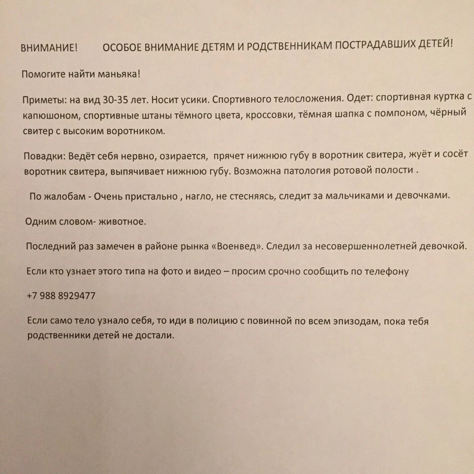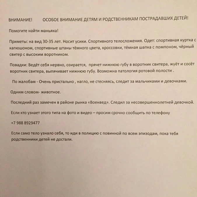 ВНИМАНИЕ! ОСОБОЕ ВНИМАНИЕ ДЕТЯМ И РОДСТВЕННИКАМ ПОСТРАДАВШИХ ДЕТЕЙ! Маньяк ходит по улицам Военведа! Помогите его найти! Приметы: на вид 30−35 лет, носит усики, спортивного телосложения. Одет: спортивная куртка с капюшоном, спортивные штаны черного цвета, кроссовки, съемная шапка с помпоном, черный свитер с высоким воротником. Повадки: ведет себя нервно, озирается, прячет нижнюю губу в воротник свитера, жует и сосет его, выпячивает нижнюю губу. Возможна патология ротовой полости. По жалобам: очень пристально, нагло, не стесняясь, следит за мальчиками и девочками! Одним словом-животное. Последний раз был замечен в районе рынка «Военвед». Следил за несовершеннолетней девочкой! Просьба, сообщать сразу в полицию!гласит сотни раз продублированное сообщение.