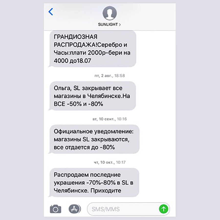 Жители Челябинска целый год получают уведомления о распродаже в сети ювелирных салонов Sunlight в связи с ликвидацией предприятия. Теперь весь товар в магазинах Sunlight якобы продается по очень большим скидкам.