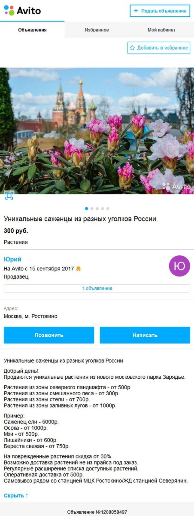 На сайте частных объявлений Avito некто Юрий организовал продажу саженцев из недавно открывшегося в самом центре Москвы парка «Зарядье».