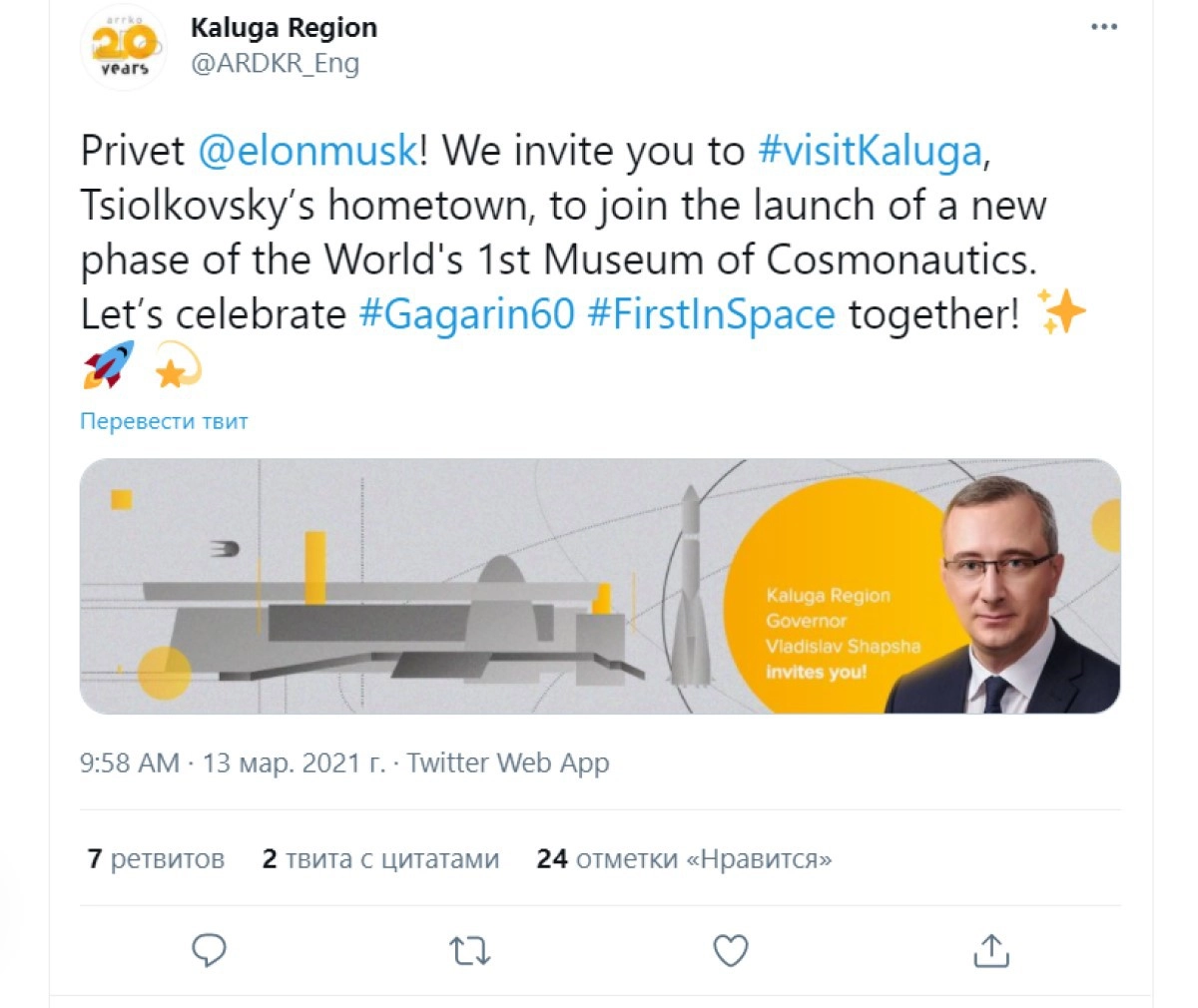 1 апреля в некоторых российских СМИ и социальных сетях появилась невероятная новость: легендарный основатель SpaceX Илон Маск принял приглашение губернатора Калужской области Владислава Шапши и вскоре приедет в Калугу, чтобы побывать в Музее истории космонавтики имени К. Э. Циолковского.