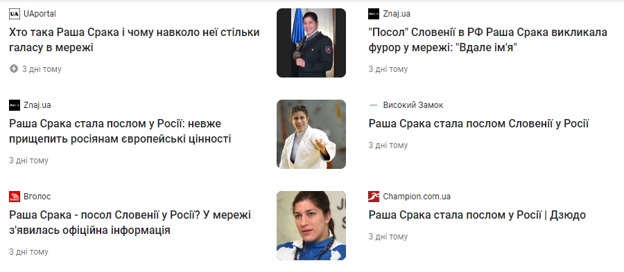 Журналисты опять попались на удочку юмористического портала «Панорама». Ряд СМИ поверили в размещенную на сайте фейковую новость о том, что власти Словении назначили послом страны в РФ дзюдоистку, чемпионку Европы 2003 года по имени Раша Срака.