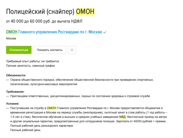 На сайте поиска работы HeadHunter появилась вакансия «Полицейский (снайпер) ОМОН» в Главное управление Росгвардии по Москве.