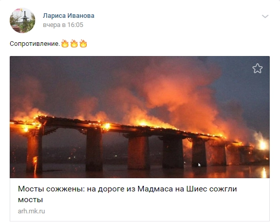 На этой недели появилась информация о начале партизанской войны в Архангельской области. СМИ сообщили, что неизвестные сожгли два моста, которые использовались для проезда техники, поставляющей топливо на стройку полигона на станции Шиес.