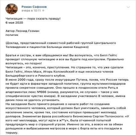 В соцсетях распространяют атмосфернейший текст о коронавирусе, чипизации и заговоре мультимиллионеров. Вот его фрагмент: