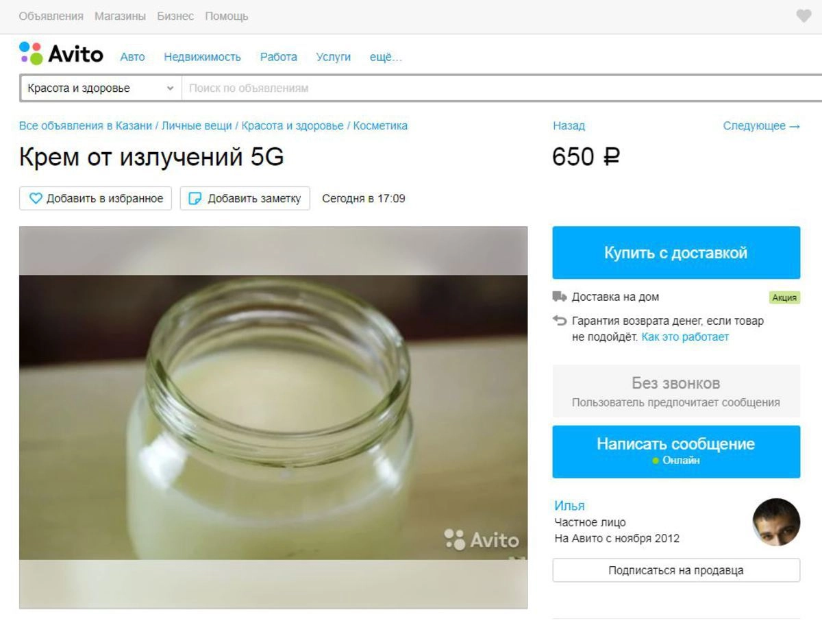 - «Защищает вашу кожу от вредных излучений новых сетей стандарта 5G. Содержит в себе гранулы металла, которые отражает радиоволны подобно сетке Фарадея. Достаточно нанести на кожу лица и головы и вы будете в безопасности», — гласит другое объявление о продаже крема, причем продавец обещает «отражение до 70% вредных излучений».