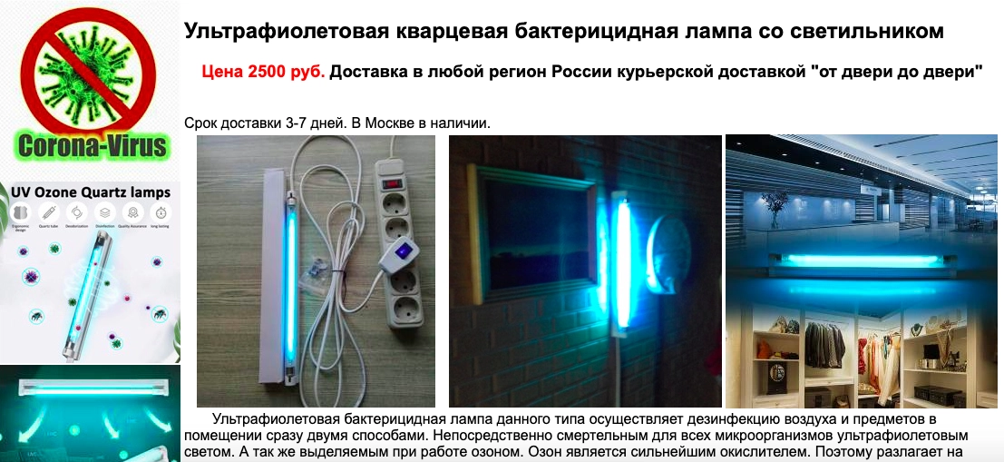 Тем временем на фейковом сайте стокоронавирус.рф продают ультрафиолетовую кварцевую бактерицидную лампу со светильником, которая применяется для «уничтожения бактерий и других микроорганизмов, таких как COVID-19, Staphylococcus aureus, E. coli, грипп, плесень и т. д».
