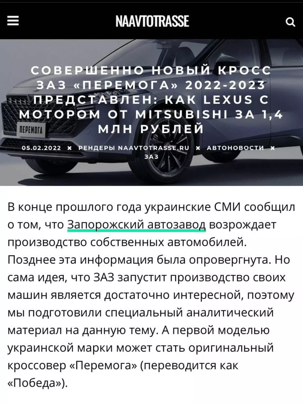 Запорожский автозавод готовит к выпуску новый кроссовер «Перемога» — очередной фейк, который несколько дней распространялся в СМИ.