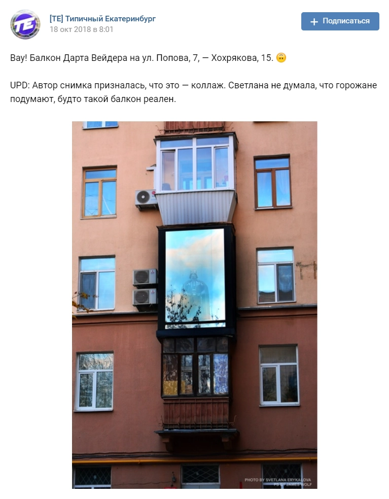 В четверг, 18 октября, в СМИ появилось фото необычного балкона, выполненного в виде звездолета темного лорда Дарта Вейдера из «Звездных войн». Журналисты писали, что арт-объект располагается в жилой многоэтажке в самом центре Екатеринбурга.
