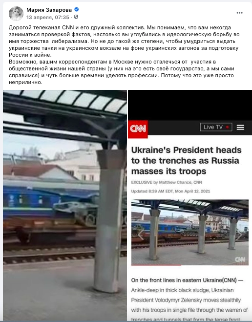 «Мы понимаем, что вам некогда заниматься проверкой фактов, настолько вы углубились в идеологическую борьбу во имя торжества либерализма. Но не до такой же степени, чтобы умудриться выдать украинские танки на украинском вокзале на фоне украинских вагонов за подготовку России к войне», — заявила Мария Захарова.