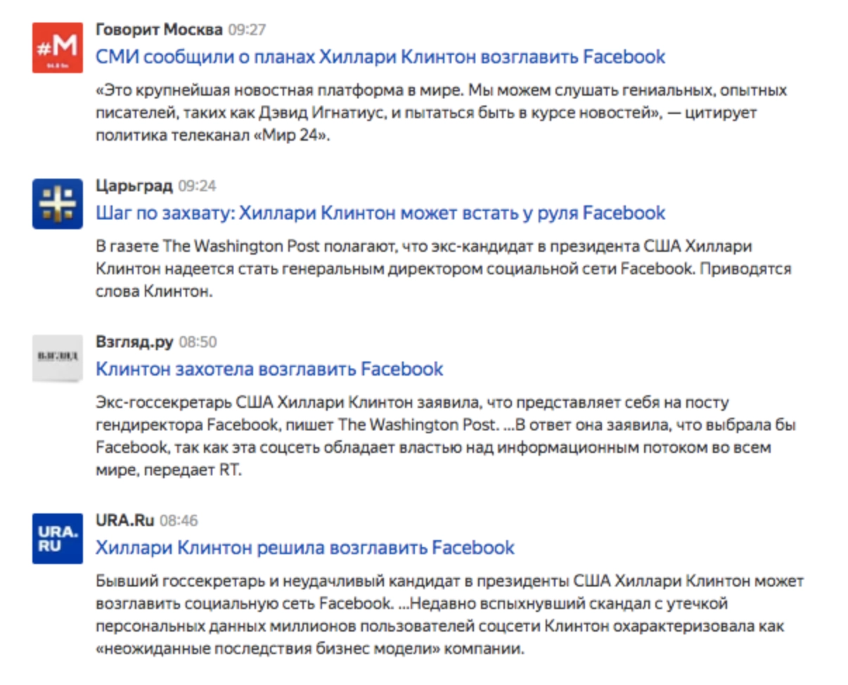 Хиллари Клинтон, уступившая Дональду Трампу в президентской гонке, собралась возглавить главную социальную сеть планеты — Facebook. По крайней мере, так подали новость «Газета.ру», «Эхо Москвы», «Говорит Москва» и другие отечественные СМИ, ссылаясь на материал издания The Washington Post.