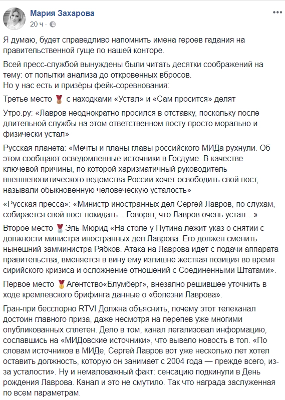 А меж тем официальный представитель МИД Мария Захарова определила призеров конкурса фейков «Лавров лишится кресла министра иностранных дел».