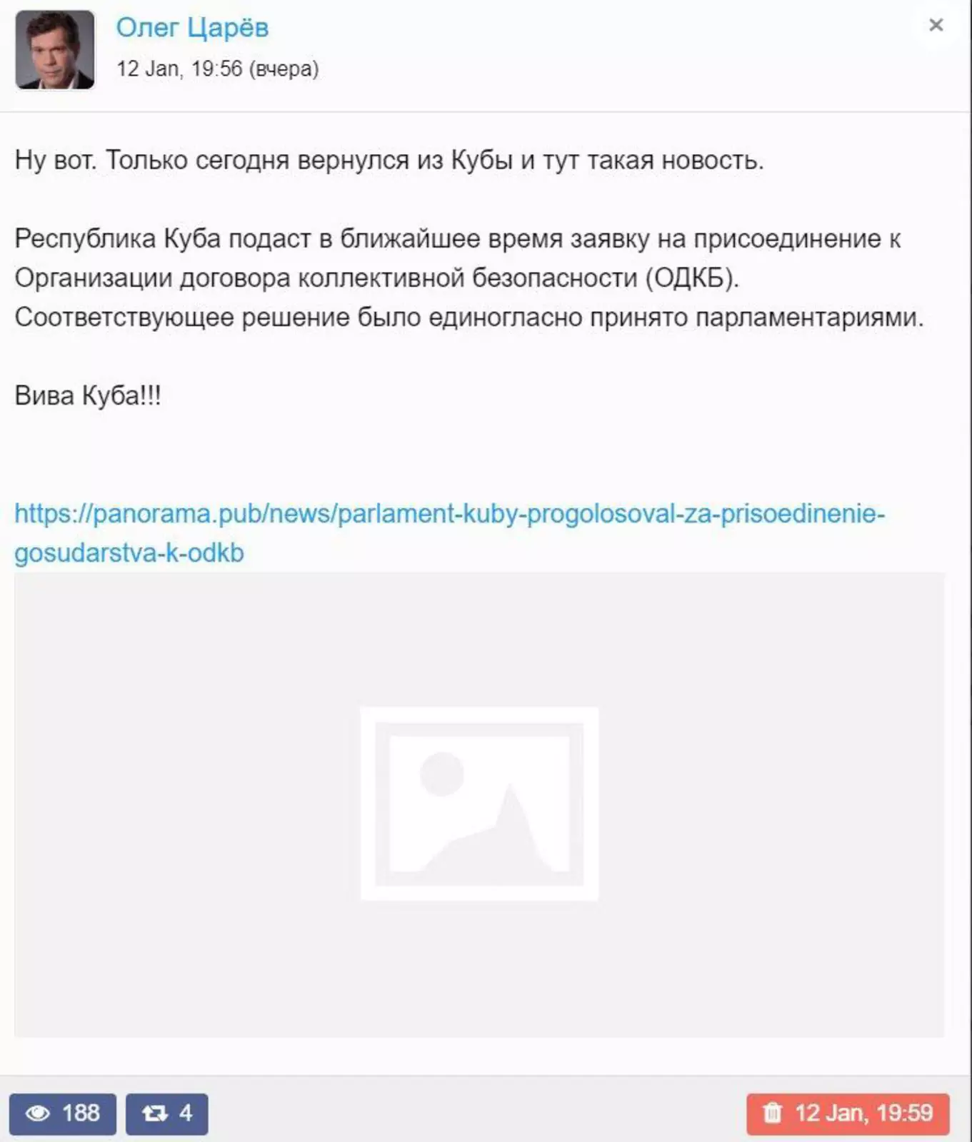 «На самом же Куба никуда вступать не собирается. Цареву стоит уже запомнить, что „новости“ с сайта „Панорамы“ к реальному миру отношения не имеют», — в очередной раз напоминает Telegram-канал «Минправды».