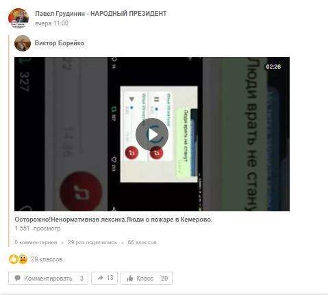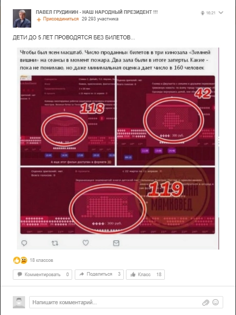 Авторы групп поддержки Грудинина называют себя «интернет-партизанами». Имеет ли к этим пабликам отношение сам директор «Совхоза им. Ленина» — неизвестно. Накануне Грудинин выразил соболезнования родным и близким погибших в кемеровской трагедии.