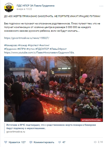 Все основные фейковые сообщения, которые распространялись в соцсетях в дни расследования пожара в кемеровском ТЦ «Зимняя вишня», активно ретранслировались пабликами в поддержку бизнесмена Павла Грудинина, созданными к президентским выборам.