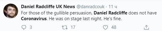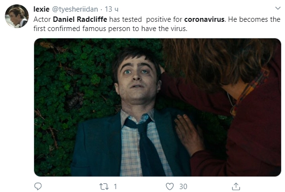 У Дэниела Рэдклиффа положительный анализ на коронавирус. Актер стал первой знаменитостью, у которой официально подтвержден диагноз, — гласило сообщение.