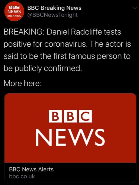Представитель Twitter сообщил, что сейчас аккаунт @BBCNewsTonight заморожен за нарушение правил социальной сети. Многие пользователи, выдохнув с облегчением, поздравили Дэниела Рэдклиффа с «исцелением от коронавирусной пневмонии».