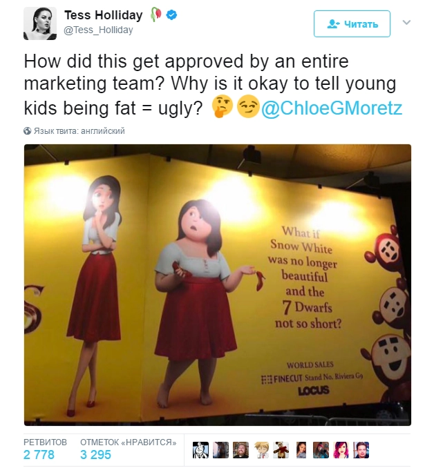 Обладательница пышных форм и ярая пропагандистка бодипозитива, 155-килограммовая модель Тесс Холидей раскритиковала создателей сказки: «Это нормально говорить детям, что толстый=страшный?»