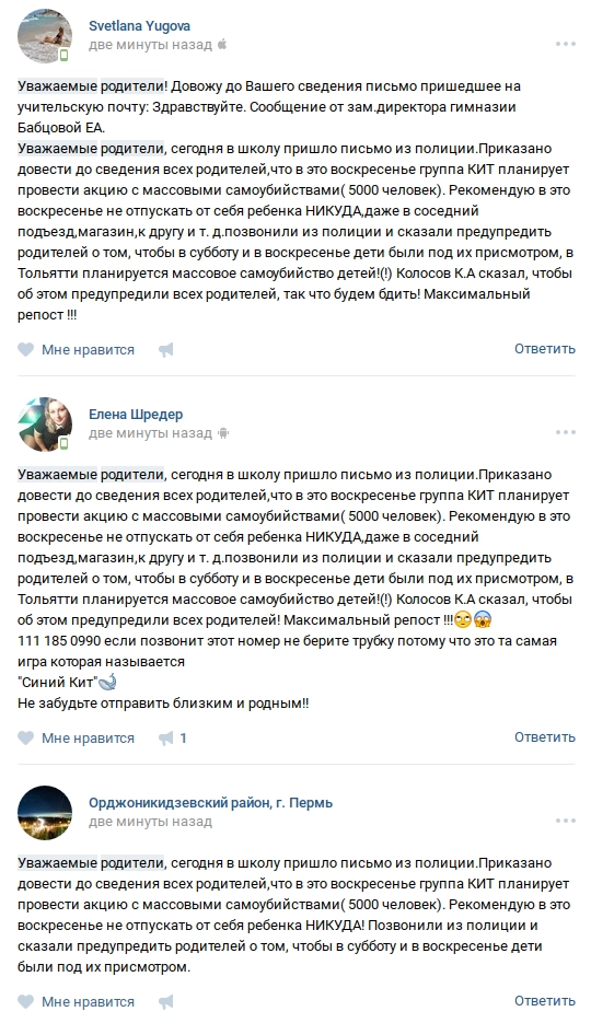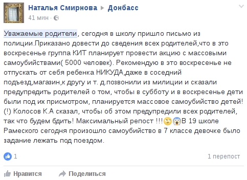 Пользователи социальных медиа в конце недели активно тиражировали письмо о готовящемся массовом самоубийстве детей. Согласно распространяемой информации, 12 марта суицидальная акция должна стартовать по всей России. Организатором детских самоубийств называют группировку «КИТ». Обеспокоенные родители просят не выпускать детей из дома и требуют распространить предупреждение. Львиная доля таких сообщений ссылается на предупреждение от МВД.