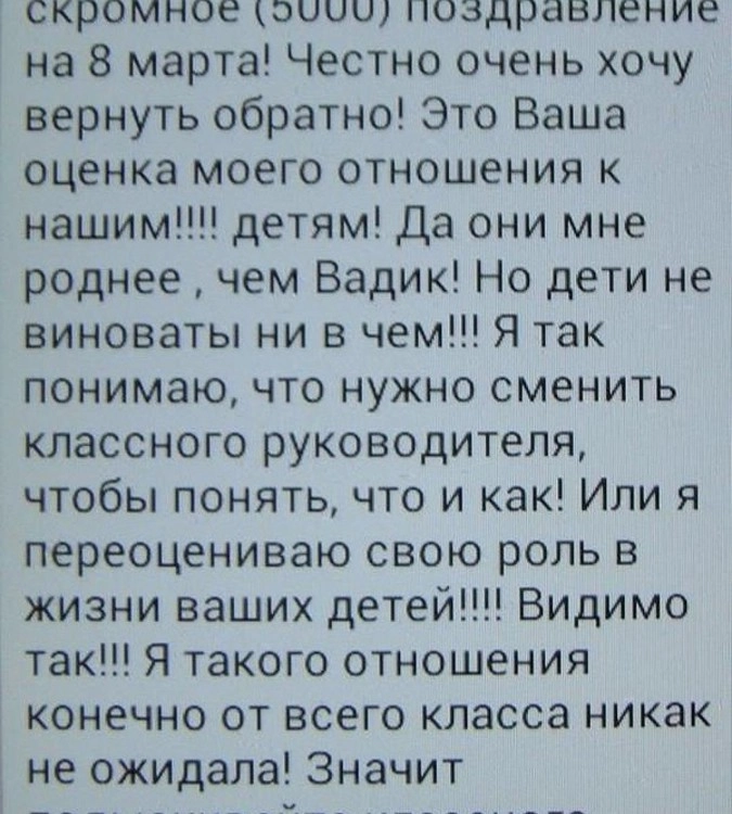 Упомянутый Вадик, как выяснилось позже на одном из форумов, — это сын возмутившегося подарку учителя, в классе которого педагог получил в подарок куда большую сумму. Исходя из этого, родители, получившие SMS, сделали вывод, что классному руководителю подарок показался незначительным.
