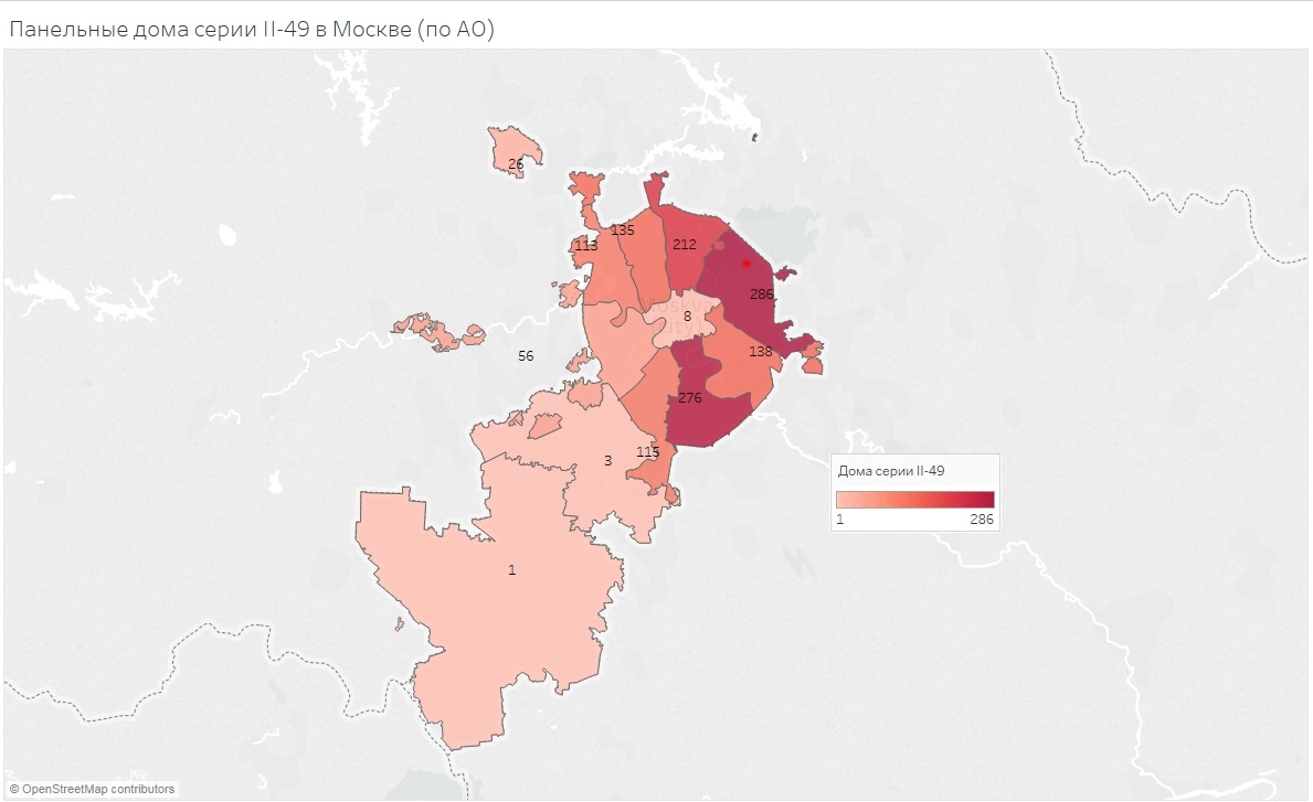 Панельные дома серии II-49 в Москве (по административным округам). Интенсивным красным подсвечен участок в районе Метрогородок