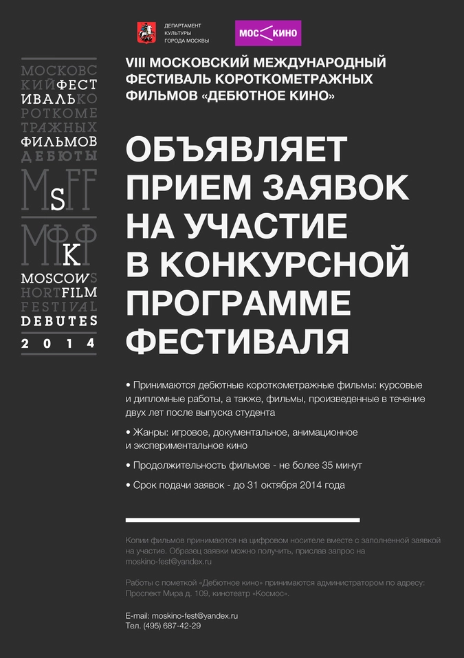Работы с пометкой «Дебютное кино» принимаются администратором по адресу: Проспект мира, д. 109, кинотеатр «Космос».