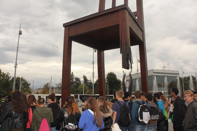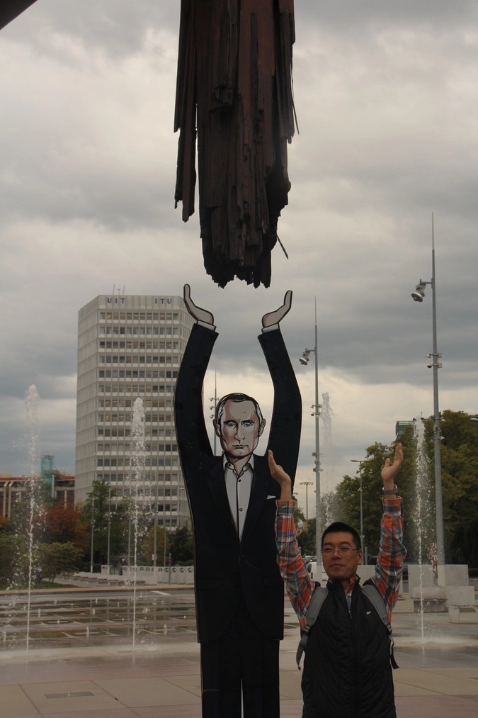 Знаменитый монумент «Сломанный стул» – 12-метровое творение плотника Луи Женсва и художника Даниэля Берсета, расположенное на площади Нации в Женеве – обзавелся недостающей ножкой. Европейская арт-группа создала трехметровую фигуру президента России, которую они поставили под сломанную ножку монумента. Таким образом активисты из Женевы выразили Владимиру Путину благодарность за миротворческую деятельность.
