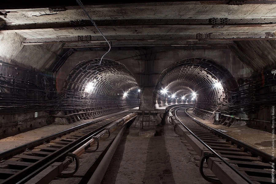 Выше на фото 2017-го года от Russos показан раструб соединительной ветви, за спиной фотографа станция «Александровский сад», впереди — «Площадь Революции». Далее начинается небольшая кривая, которая видна на схеме, а потом идёт длинный прямой участок с уклоном. Вот там я предлагаю сделать «врезку» новых камер съездов.